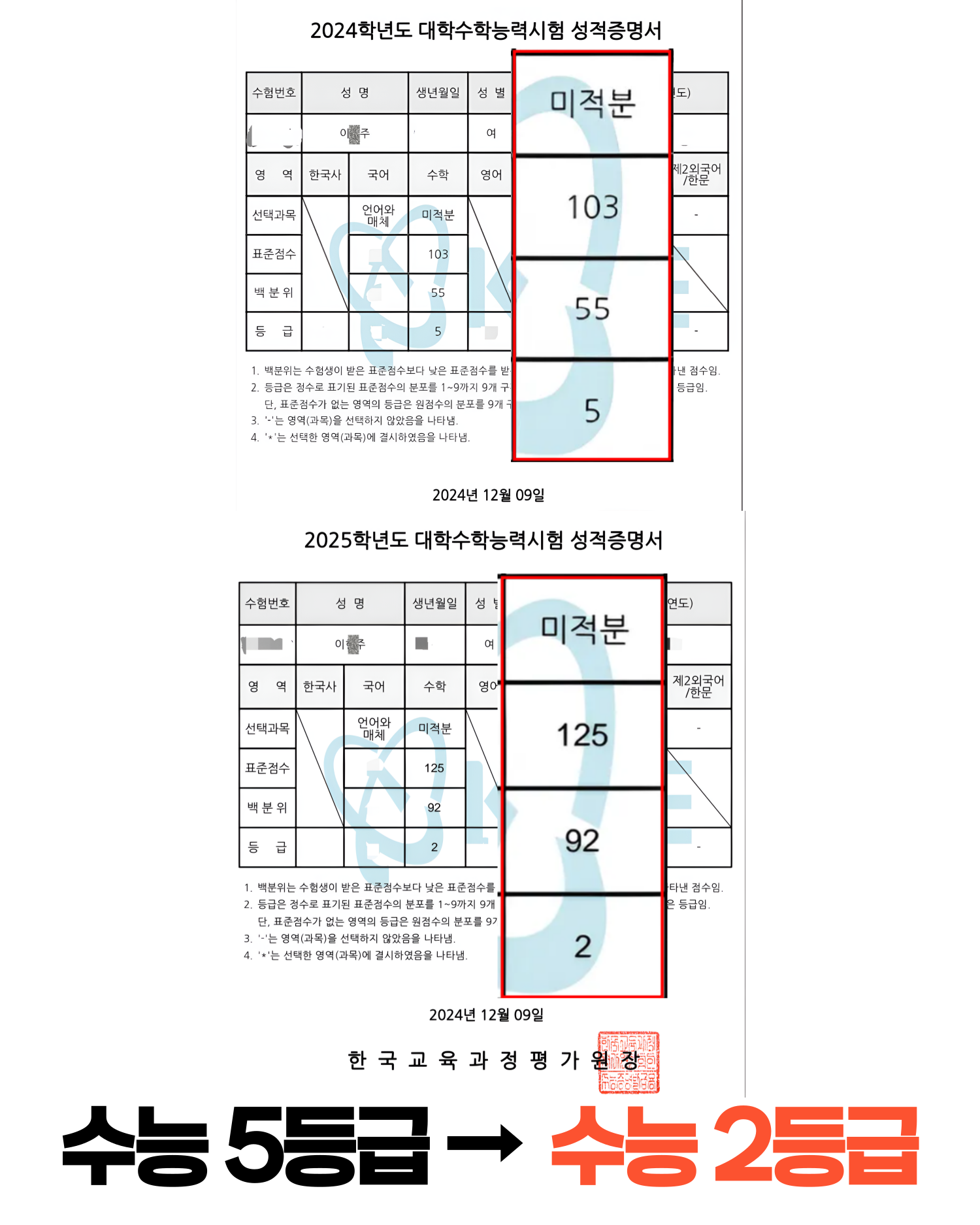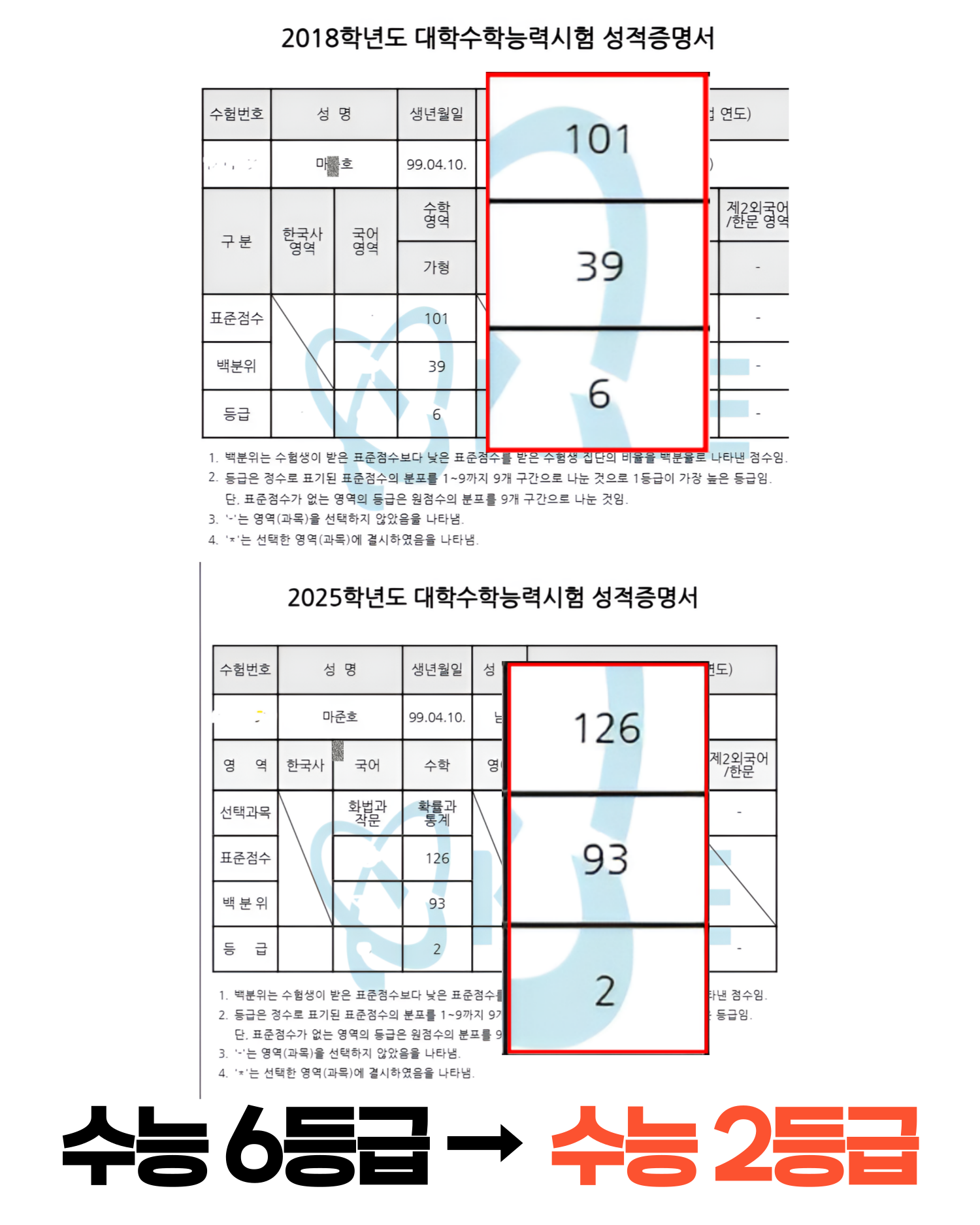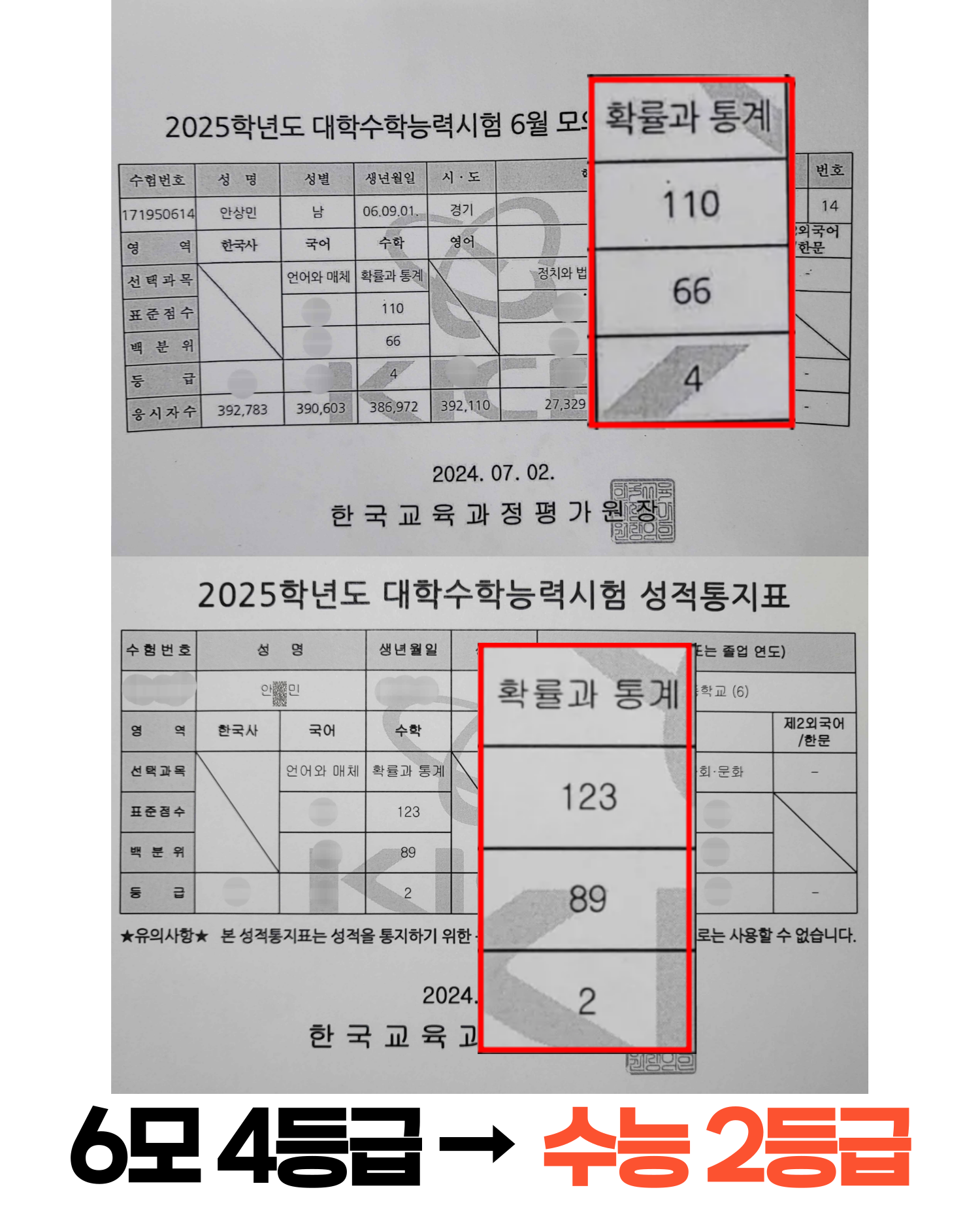 이제는 3~5등급의 잘못된 습관을 이해하는 강사에게 맡기세요. 삼수시절 일관된 원칙을 적용하고, 추가로 100분을 복기하는 실모공부법으로 4등급에서 1등급까지 만들었습니다.