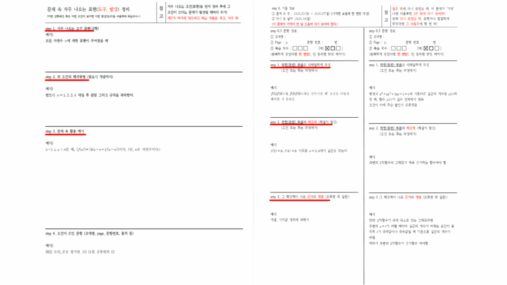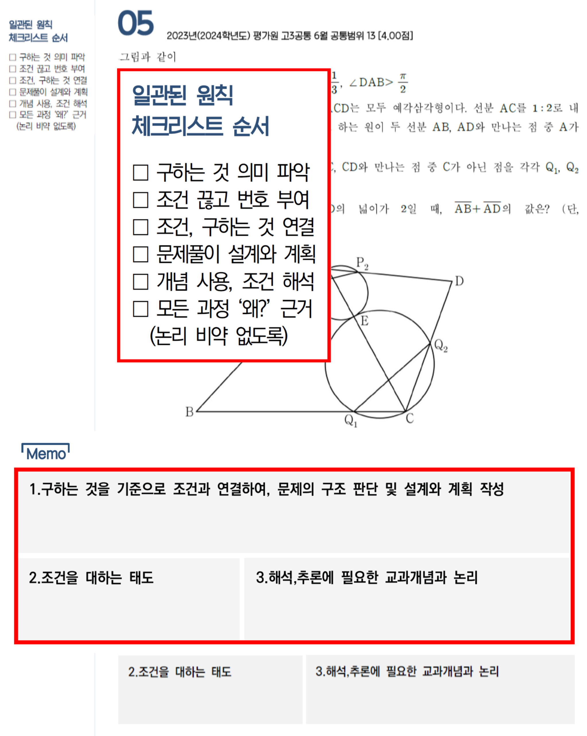 문제 푸는 순서 고정, 조건을 개념적으로 해석, 발견적 추론 실시