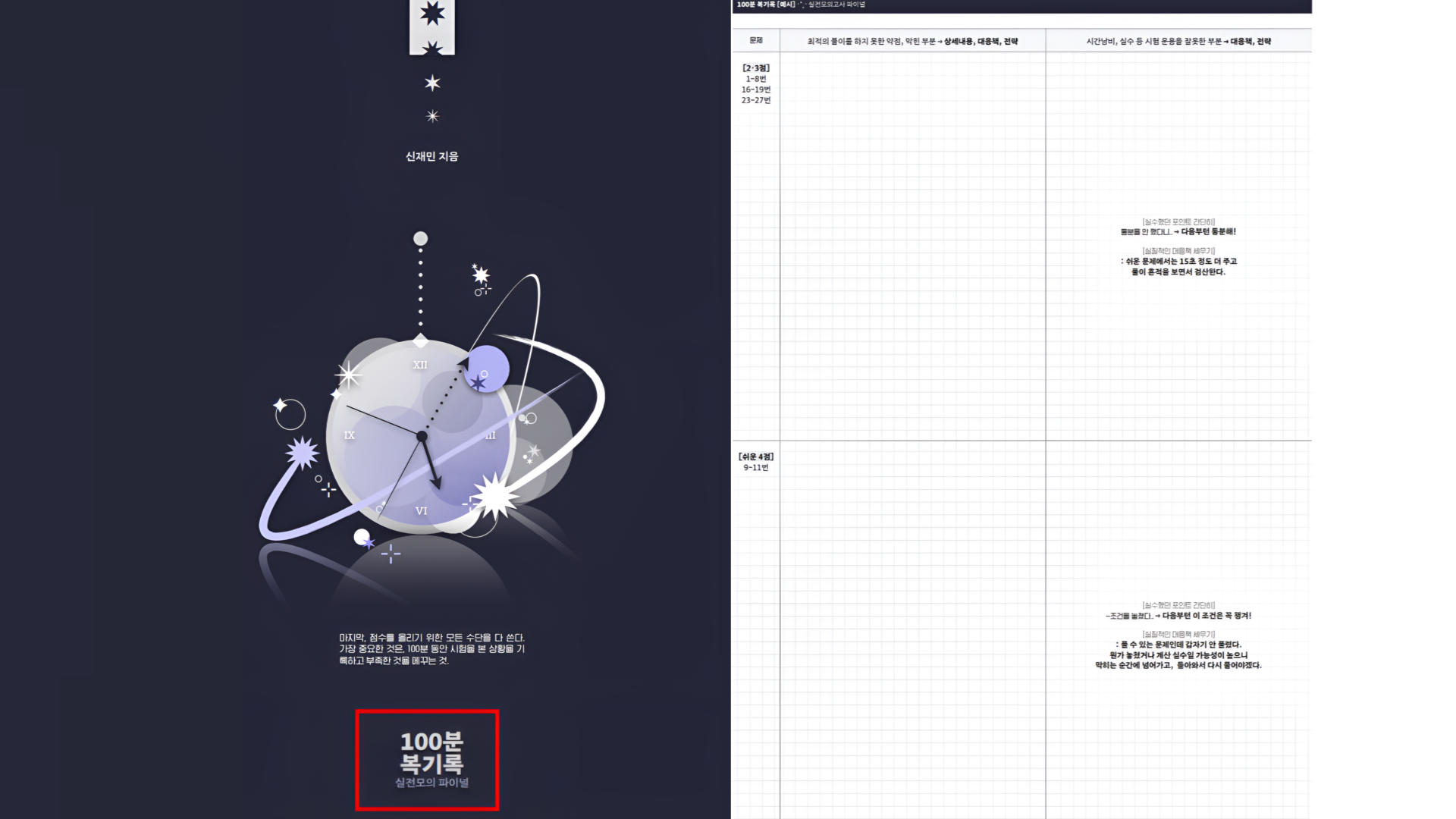 최고의 100분 전략을 만들기 위해, 실모를 풀기 전, 과정, 후로 나눠서 공부법을 전수합니다.